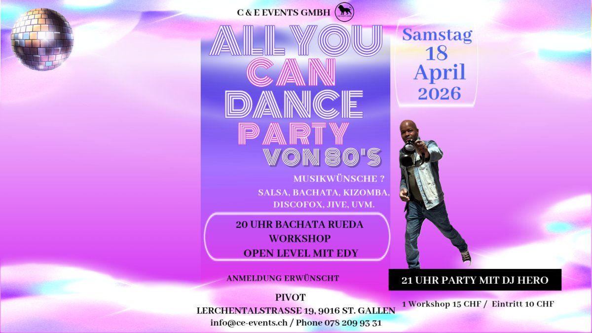 Bei WhatsApp mitmachenTanzevents.ch bietet eine umfassende Liste von Tanzpartys und Tanzveranstaltungen in der deutschsprachigen Schweiz. Unser Ziel ist es, eine Vielzahl von Tanzstilen abzudecken. Organisierst du eine öffentliche Tanzparty mit guter Musik? Trage dein Event direkt über unser Eventformular ein! Auch Tanzschulen sind herzlich eingeladen, ihre Tanzpartys bei uns zu veröffentlichen. Alle eingegangenen Formulare werden moderiert freigeschaltet.